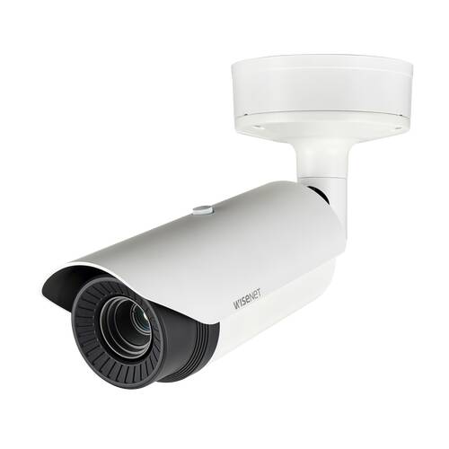 Wisenet T-Netzwerk-Wärmebildkamera für den Außenbereich, QVGA @30fps, 35mm-Festobjektiv (6,3°), dreifacher Codec H.265/H.264/MJPEG mit WiseStream II, Mehrfach-Streaming, erweiterte Videoanalyse und Tonklassifizierung, Fluransicht, Bewegungserkennung , Stoßerkennung, Temperaturerkennung, Handover, 7 Farbpaletten, digitale Bildstabilisierung mit integriertem Gyrosensor, bidirektionales Audio und microSD/SDHC/SDXC-Steckplatz, IP66, Nema 4X, PoE/12VDC/24VAC.